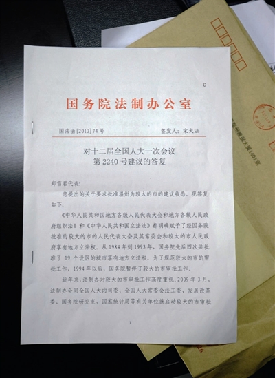 全国人大代表、温州晚报雪君工作室主持人郑雪君今年在全国两会期间递交了《关于要求批准温州为较大的市的建议》,日前她已得到国务院法制办的回复。