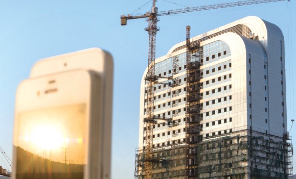 图片右侧为在建的瑞安客运中心站大楼,与左侧的iphone4和iphone5紧贴在一起的造型有几分相似。