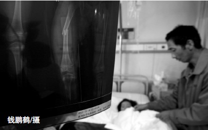 昨晚,记者来到医院时,小玲刚做完检查回到病房。小玲的整个右臂和右腿膝盖都缠着纱布。医生介绍,小玲的右臂四处骨折,右腿大腿骨完全骨折(CT片如图),腹腔内有少量积液。小玲的肝脏受到了创伤,为防止肝脏破裂,目前还不宜挪动。等到腹腔内的积液被慢慢吸收后,再考虑为右腿做手术。医院计划于下周四为小玲做详尽检查,具体手术时间要视小玲的身体情况而定。