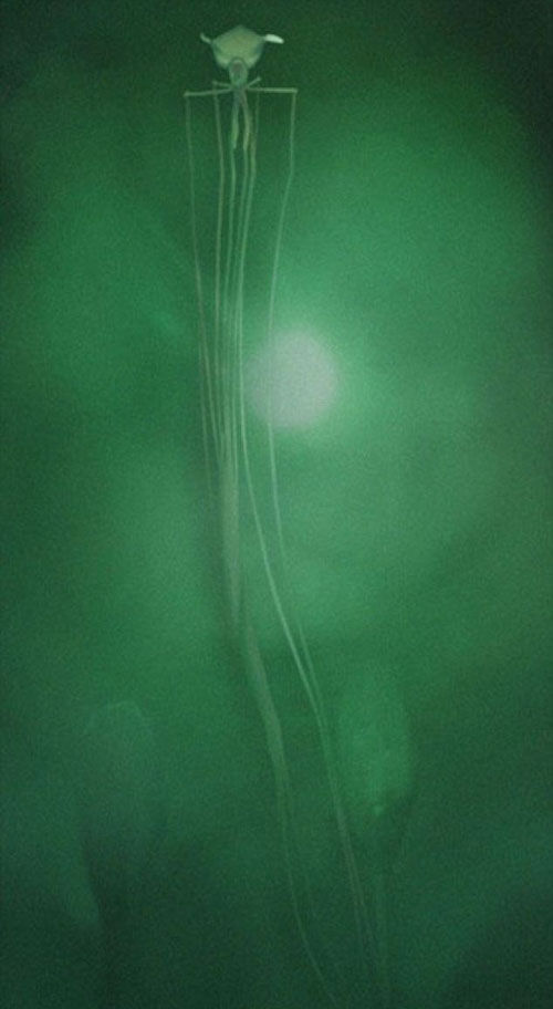 这种Mangapinna乌贼又被称为长臂乌贼,这种乌贼全长可达8米,触手可长到身体的15到20倍。成年长臂乌贼从未被捕捉到过,也没有其样本,直到壳牌公司摄像机偶然抓拍到这种类似外星生物的照片。