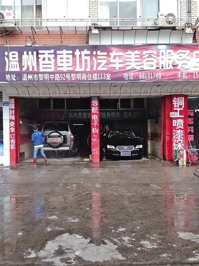 占道经营、污水横流的洗车店可不止这一家。记者在市区黎明中路“温州香车坊汽车美容服务中心”店门前看到,污水几乎占据了整个人行道。而店里用于车内清洁的吸尘器则整个摆在门对面的公交站台上,各种电线缠绕于路面,等车的人只得小心地绕着走。另一边,四五个工人正围着一台越野车擦干、吸尘。