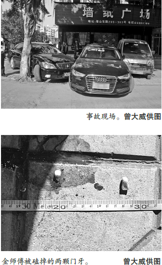 面对眼前一幕,蔡先生赶紧报警。他说,被撞男子脸朝下倒在地上,附近掉落着两颗磕掉的门牙,血迹斑斑。肇事丰田车卡在奥迪车与一棵行道树之间,丰田车车头左侧破损严重,而奥迪车右侧车身凹陷严重。肇事女司机下车后,显然被吓呆了,不停地哭泣。