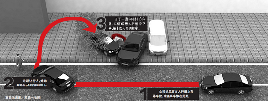 陈某说,小块空地高于路面行车道近20厘米,她打算向右打方向盘,再踩油门,让车辆冲上人行道停车。这时,前方刚好有人经过,为避让行人,她便赶紧去踩刹车,不料车子却突然加速向前冲去。当时因为紧张,她的双手一直向右打着方向盘,所以车辆避开了前面的路人,却调转了近180度向下冲去。陈某下车查看情况后惊呆了,很长时间才缓过神来。
