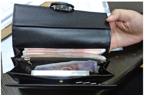 昨晚7时48分,蒲州派出所民警到达现场。这时,金川角大酒店工作人员在207包厢内找到一个用衣服包裹着的黑色钱包。经王女士确认,这个钱包正是她的。