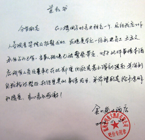 酒店方出具书面致歉信