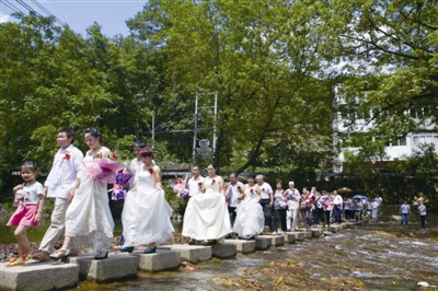 永嘉县岩头镇五尺社区水西村16对中老年夫妇举行祝福爱情的集体婚礼。郑晓群摄