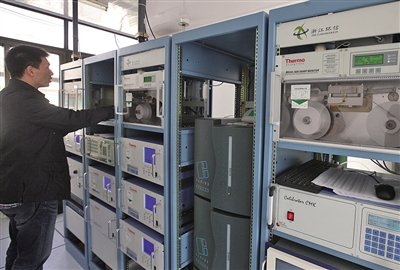 在该站自动监测室,记者看到,这是一个由6台监测仪和若干管路组成的“大家伙”。每台监测仪负责监测一种污染物,涉及二氧化硫、二氧化氮、臭氧、一氧化碳、PM10、PM2.5等六项。在监测室上方的楼顶平台上,则安装着4个伞状采样头,将实时采集的空气源源不断地输送到各台监测仪。“这称得上是目前国内比较先进的空气质量监测手段。”该站高级工程师、自动监测室主任涂圣锋说。