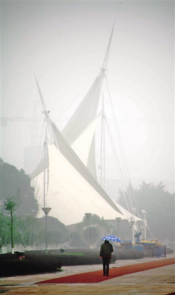 今年1月21日,市区空气质量等级达到重度污染,超标的PM2.5让往日热闹的帆影广场变得冷冷清清。陈翔摄