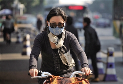 昨天上午,一名戴着口罩的市民骑着自行车从市区人民路经过。翁卿仑摄