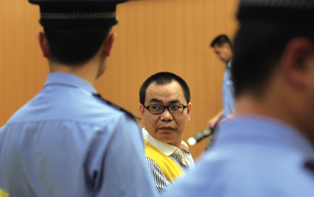 2013年6月13日,温州市中院大审判庭,林春平在庭审现场不时回头向后张望。