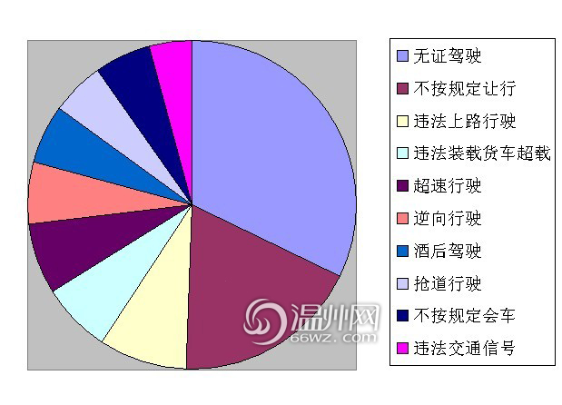交警部门根据不同交通违法行为造成的人员伤亡情况,列出了我市十大危害交通安全的交通陋习:一、无证驾驶,占15.3%。二、不按规定让行,占8.7%。三、违法上路行驶,占4.08%。四、违法装载货车超载,占3.32%。五、超速行驶,占3.32%。六、逆向行驶,占2.81%。七、酒后驾驶,占2.81%。八、抢道行驶,占2.55%。九、不按规定会车,占2.55%。十、违反交通信号指示,占2%。