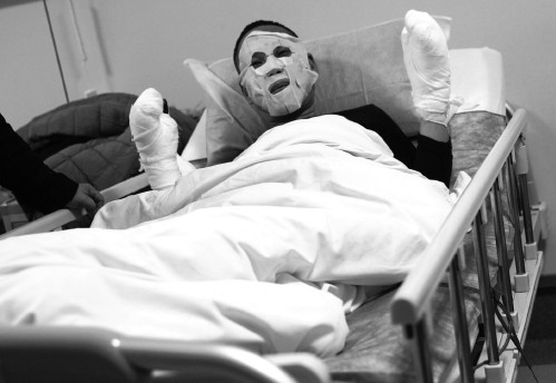昨天晚上6时多,50多岁的林先生躺在解放军118医院里,不断地喊“疼,我疼”。他的脸上敷着烧伤后补水用的面膜,两只手、腿脚都缠着厚厚的纱布。