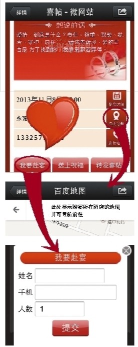 记者在金小姐的一位好朋友、市区某事业单位的叶先生手机上看到了这份微喜帖。叶先生说,前几天,他在微信上收到金小姐发来的一个链接,打开一看,是一份特别的电子请柬。该微喜帖首页是一封漂亮的邀请函,进一步点开后里面有多张新人的婚纱照,并介绍了婚礼时间和地点(右上图);“新人故事”讲述了两人浪漫的爱情;酒店的电子地图,点击可以直接链接到百度地图进行地点查看和路线导航(右中图);独特的“我要赴宴”页面可以让被邀请的亲朋好友回复自己能否参加婚礼(右下图),协助新人预估到场宾朋人数;最后还有“送上祝福”一栏,可以在这里为新人献上一份祝福。