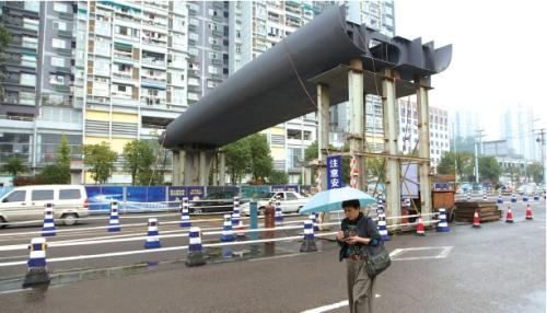 施工方一位负责人称,天桥主桥分两段,共4片钢箱梁结构。此前,两片长26米的钢箱梁已于前天夜里至昨日凌晨完成吊装。