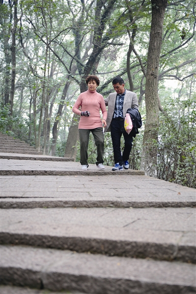 汪祥德:因为大观亭所在地,可以说是华盖山的山顶,我之前数过,从山脚到这里差不多1000多步。我是2012年4月开始上山,那时每天来两次,早上6点40分用轮椅将她从家里推到山脚大概要十几分钟,然后将轮椅锁在下面,扶着她开始爬山。到山顶后再在石凳上给她按摩一小时,下山去花柳塘那儿做电疗,然后回家。吃完午饭睡个觉,2点多又推她来。后来她好了,从2013年开始,就改成早上陪她来一次。