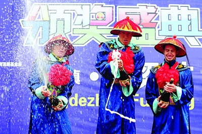 前三名的车手身着清朝官服坐上花轿,在唢呐声中登台领奖。