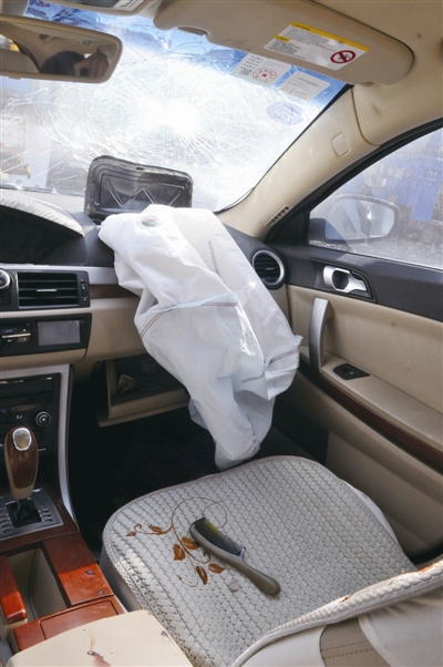 昨天下午,记者在虹桥连桥村城东停车场,找到了出事的荣威轿车。车头保险杠脱落,车内两个安全气囊都已弹出。而副驾驶室的安全气囊上,还留有一些较短的毛发与血迹。副驾驶座上留有一些孩子的玩具以及梳子,正对着的前风挡玻璃,已破碎成蜘蛛网状。