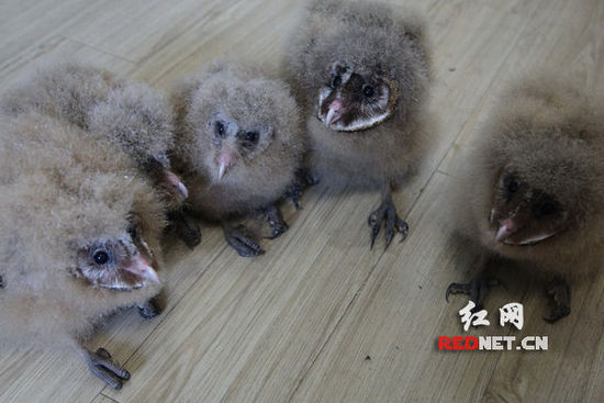 隆回县森林公安局接到报警电话后,立即与县林业局野生动物保护专家前往调查,这5只怪鸟原来是国家二级保护动物猴面鹰幼崽。