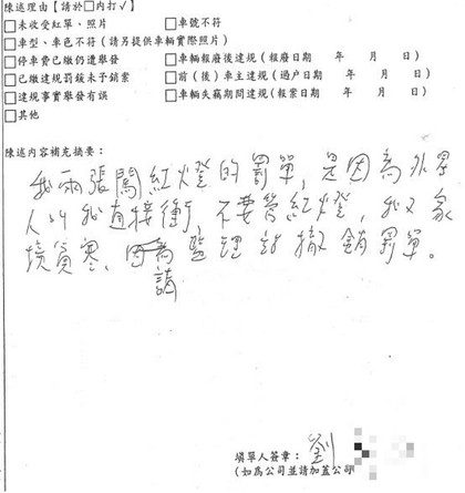 屏东警分局在日前接获民众告发,警方循线展开调查,证实男子的确违规,必须缴交1800元台币罚款。不料,屏东警分局竟在25日收到监理站来文,指出刘男请求撤罚,理由还写上“我两张闯红灯的罚单,是外星人叫我直接冲,不要管红灯”,让处理的员警满是无奈。