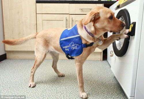 这家慈善机构还训练工作犬来收取信件、打开电灯开关、开门、帮助主人穿脱衣服等等。