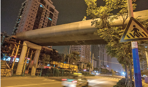 施工方负责人任志坚介绍,过街天桥主桥吊装分为两个阶段进行,其中北侧主梁已于昨天凌晨完成吊装,今天凌晨完成剩余部分。接下来,施工方将进行安装栏杆、浇筑混凝土、铺设花岗岩等后期附属工程,还将在天桥两端铺设梯道。完工投用后,将取消新城大道位于新城站西首的斑马线,新城大道南北两侧新城站公交站台也将分别向东、西方向迁移。