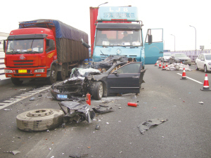 浙江在线11月28日讯 前天下午3时半许,杭州湾跨海大桥上,一辆凯美瑞轿车被后方集卡车追尾撞上,巨大的冲力将它顶到了前方一辆半挂车尾部,车体严重变形,并冒烟起火。