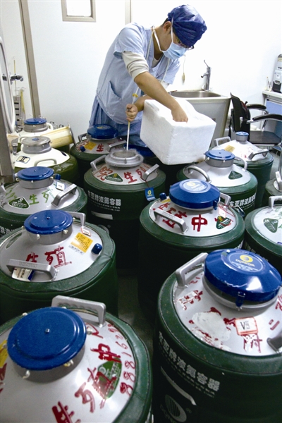 在该院生殖中心实验室液氮罐内零下196摄氏度的超低温环境下,存着5180份胚胎,时间最长的已经在液氮里冷冻了十年,与他(她)同时形成胚胎的哥哥或者姐姐,如今可能已经9岁,而作为没有被选中在母亲子宫里发育的胚胎,依旧在超低温下静静等待着有朝一日解冻。据医生介绍,截至目前,已经有数百对夫妇在取得二胎准生证后,在该院把冷冻中的胚胎解冻,成功受孕。