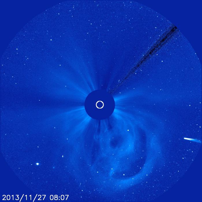 然而随后最新的SOHO LASCO C2图像上却可以隐约看出这颗彗星似乎经历了浴火重生。美国宇航局官方网站截至目前对此尚未发布确定结论,但表示ISON彗星“很可能已经解体”。这样跌宕起伏的情节和出人意料的进展也让这颗彗星越发让人感到难以捉摸。 “太阳与日光层探测器”(SOHO)记录下了ISON彗星掠日全程。