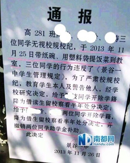 南都讯日前有网友爆料,“云南景谷县一中3名高中学生用纸碗和塑料袋提饭到教室,学校决定将3人开除学籍,并降为借读生留校察看半年,其中2人的补助金也被撤销。”景谷一中负责人昨日证实确有此事,称学校此前明令禁止学生使用纸碗、塑料袋提饭到公寓或教室,“虽开除学籍,但不影响继续上学。”