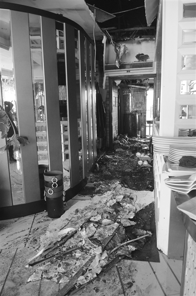 昨天中午,记者来到现场时,火势虽然已被控制,但餐厅里还是充满了呛鼻的烟味,餐桌上落满烟灰。顺着飘来的烟雾,记者找到了厨房,餐厅厨房此时已是一片狼藉,天花板已经被水冲塌,地上到处是水迹和杂物,厨房过道外边就是连接着的烟囱,员工正在那清理。