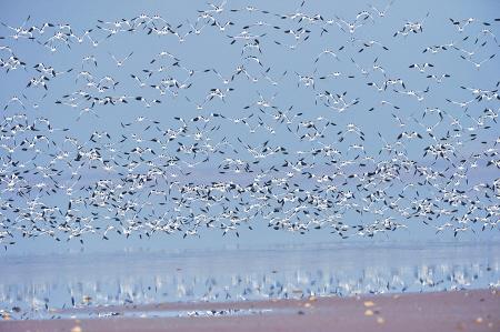 一大群反嘴鹬密密麻麻占领了一大段湖滨,起起落落飞个不停。