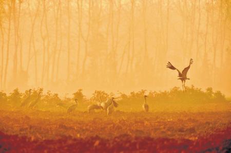一群灰鹤在湿地悠闲的歇脚觅食。均为李锋摄