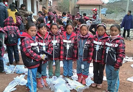 昨天上午10时,当地的温度在零度以下,树上挂满雾凇。在联补乡中心校的临时操场上,孩子们领到了温州人捐赠的御寒衣服后,激动地鼓掌。看着有些鼓掌的学生只穿着单薄的衣服,爱心团队人员赶紧让孩子们先穿上棉衣。附近的村民也纷纷赶来,爱心团队的人员也把一些棉衣、内衣送给村民。活动结束后,爱心团队的人员蹲在屋外吃了一顿简单的饭,又往大山深处出发,一路送棉衣。