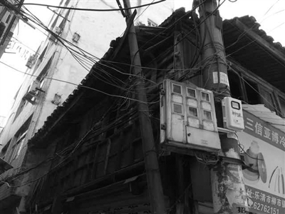 而房子外面星罗棋布的电线电缆更让周边居民担着心。他们指着紧挨着墙根的一根电线杆子说,“你看,这杆子现在全靠电线把它拉拉住。”这根电线杆子已经倾斜了35度左右,“旁边还装了这么多电表、仪器,万一哪天短路起火,烧着这个木头房子怎么办?一着就是一大片呀!”