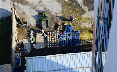 在槽罐前面的空地上,整齐地摆放着近两百个塑料桶,其中蓝色为40公斤装,白色为60公斤装,且大多数已经装得满满的;一侧的墙角,则叠加堆积着上百个蓝色的空桶。记者看到,所有这些桶上都没有任何包装,也没有危险化工品的标识,全是“白卵”桶。一名中年男子正拿着一根管子往剩余空桶里装硫酸,还有两个年轻人在边上等待。