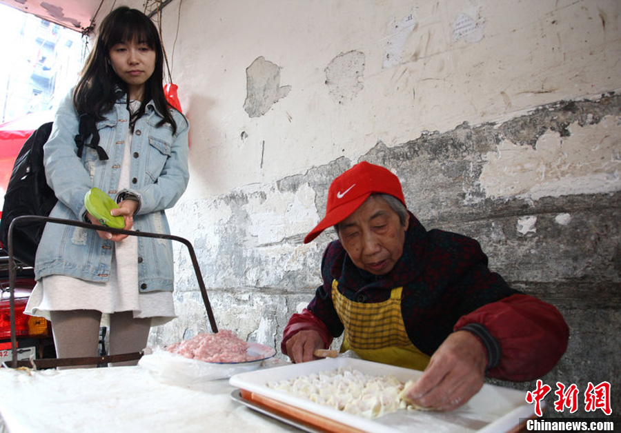 12月2日,长沙韭菜园路一巷子里,万奶奶正在紧张地包馄饨中,不少顾客从上午便在此开始等候。蒋丽梅摄图片来源:CFP视觉中国