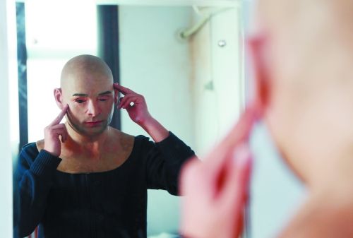 记者亲自试戴“人皮面具”,正在镜子前调整眼睛、鼻子、嘴巴、耳朵的位置