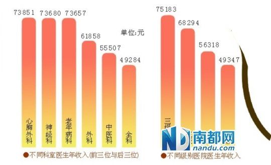 南都讯广东省医生平均年收入8万出头,排大陆第三,第一名北京的医生平均年收入也仅有10万出头。近日,医学专业网站丁香网公布2012-2013年度中国(仅涉及大陆地区)医生薪酬情况调查报告,结果显示,心胸外科、神经科和老年病科医生收入最高,而外科、中医科和全科医生的收入垫底。