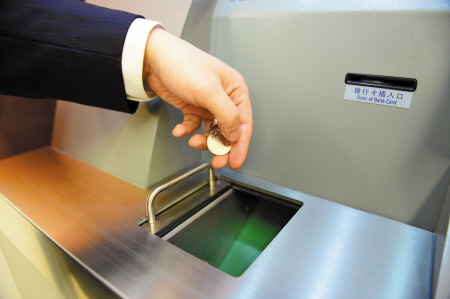 ▲把硬币放进自助兑换机储币斗(徐佳伟摄)