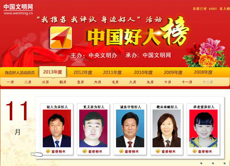 在11月份“身边好人”的推荐、评议过程中,广大干部群众踊跃参与,他们通过网络、手机平台、电子邮件等方式推荐大量好人好事,各地文明办对这些好人好事线索通过多种方式进行了核实,精心组织了事迹材料。经层层筛选、逐级把关,各省(自治区、直辖市)文明办按照“事迹感人、社会反响大、示范引领作用明显”的要求,共审核推荐了676位“身边好人”为“中国好人榜”11月候选人。中国文明网分“助人为乐”、“见义勇为”、“诚实守信”、“敬业奉献”、“孝老爱亲”五大类别,对这些候选人进行了为期1个月的集中展示宣传,广大网友、手机用户通过网络留言、投票、短信转发等方式踊跃参与了评议。