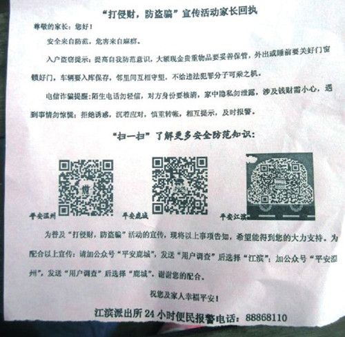 江滨派出所的教导员解释,宣传单中给出“平安温州”等三个微信公众号的二维码,让家长添加微信公众号,主要是希望家长通过查看这些公众号,了解一些上当受骗案例,更好地学习安全知识。他说,公众平台也是派出所宣传安全知识的一个渠道,希望更多市民关注、了解。
