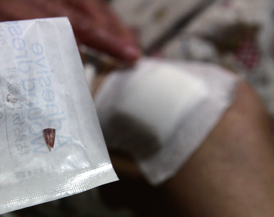 蓝女士说,今年12月份以来,这处伤口又疼痛得使她晚上都睡不好觉,甚至还发现伤口内硬物的位置跟以往比,竟然已缓慢下移近一寸。12月6日,疼痛难忍的蓝女士又一次来到市人民医院就诊,经手术后才知道,原伤口里的硬物,并不是什么线头,而是一块玻璃碎片。