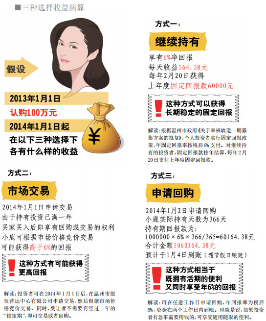 温州市域铁路S1线增资扩股一期面向社会募集至今已满一年,很多投资者关心,这笔投资有多大的回报。投资满一年后,他们可以有三种选择——继续持有、交易或回购。假设常用的虚拟人物小鹿于2013年1月1日认购100万元,2014年1月1日后,小鹿如果分别作出不同的选择,各会有什么样的收益呢?昨天,温州市铁投集团相关人士对后续政策进行了解读。