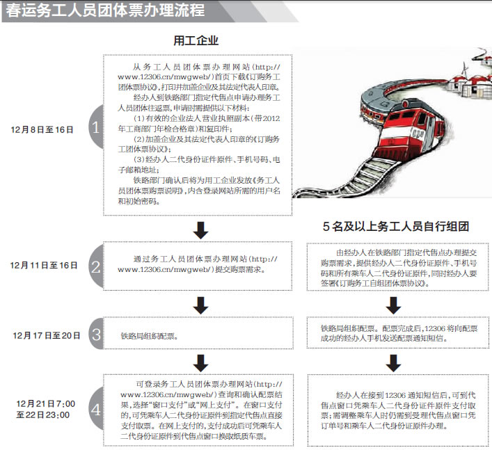 12306铁路客服人员说,由于临时旅客列车的运能非常有限,旅客提交购票申请后不能完全满足购票需求。12月16日,购票申请结束后,12月17日至20日,铁路局将组织配票。配票完成后,12306将向配票成功的自组团的经办人手机发送配票通知短信。企业团体订票人员可在12月21日上午7时以后,登录务工人员团体票办理网站(http://www.12306.cn/mwgweb/),通过“配票结果查询”查看配票结果。