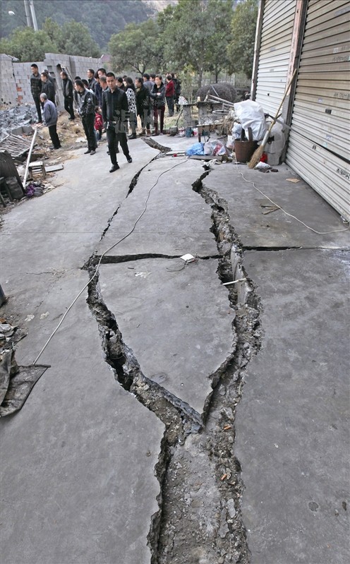 昨天,瑞安市塘下镇凤胜村两幢居民楼前的道坦发生开裂。记者蒋超/摄