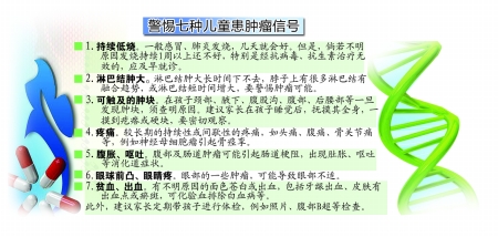 在我国,儿童未进行常规定期疾病筛查体检,因此许多儿童当被确诊患肿瘤时就已经处于中晚期,延误了治疗最佳时间,造成了严重后果。日常生活中,家长应高度警惕孩子的一些不正常反应和症状。她建议家长要掌握有关儿童肿瘤的科普知识,仔细观察孩子的身体状况,定期为孩子做疾病筛查体检,早期发现肿瘤性疾病,以提高治愈率;同时培养儿童不挑食、不偏食,均衡营养,增强免疫力,不买激素类食品给孩子,坚持让孩子锻炼身体。虽然肿瘤很凶险,但如果早期治疗,儿童肿瘤总体治愈率还是能达到70%以上。