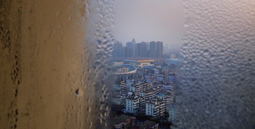 室内外温差大,玻璃上容易起水雾,结成水珠。窗外的城市看起来有些模糊不清,但我更愿意把它想象成一幅沐浴晨曦的朦胧画。