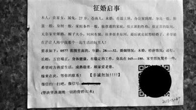 记者以征婚者妹妹的身份与她对话。她说,自己高中毕业后就来温打拼,平时工作忙碌,朋友圈小,身边没有适龄男青年。“家里催婚,我也着急,很想结婚,但又高不成低不就。”“就在前几天,我下班后,拿着准备好的15张征婚启事,趁夜黑在车站和小区进行张贴,为了防止同事看到,还避开了工作地点。”