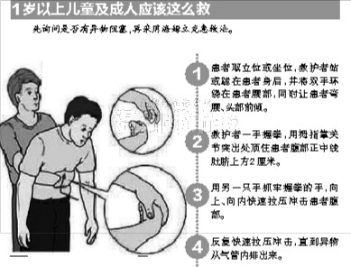 还有一种情况,当成人出现气管异物阻塞,而身边又没有其他人时,趁自己还有意识前,马上将自己的腹部趴伏在椅背上,向下快速挤压上腹部,同样通过产生气压使异物排出。或者一只手握空心拳,拳眼置于肚脐上2厘米处,另一只手紧握此拳,快速向上冲击腹部,至异物排出。
