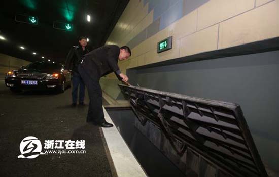 从北侧隧道口进入后,在行车道的右侧你会发现每隔80米就有长约3米、宽1米的钢板,钢板下面就是逃生通道。全长4450米的钱江隧道,共有108个逃生入口。